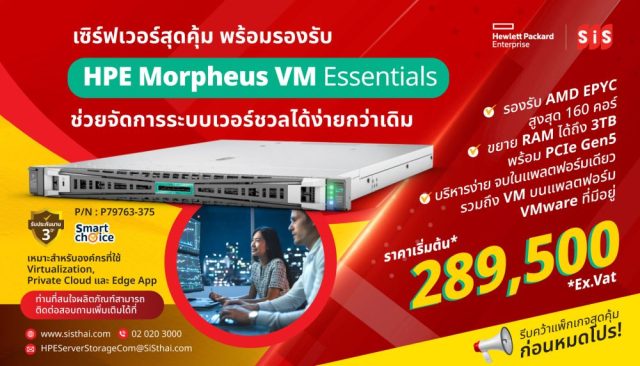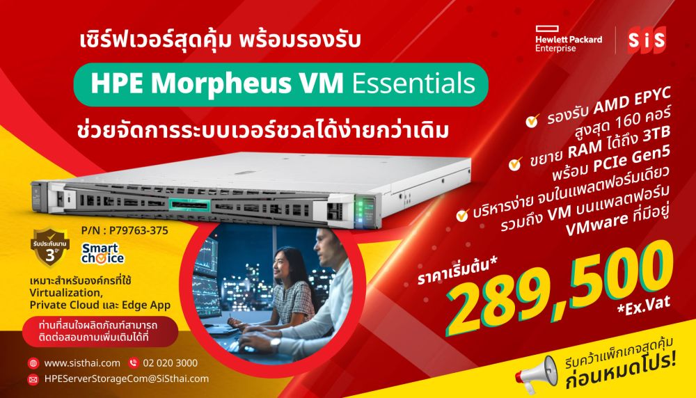 แพ็กเกจราคาพิเศษ สำหรับลูกค้าองค์กร ที่สั่งซื้อ DL325 Gen11 พร้อม HPE VME วันนี้ รับข้อเสนอราคาสุดคุ้ม และบริการสนับสนุนระดับมืออาชีพจากทีม HPE ที่คุณไว้ใจได้